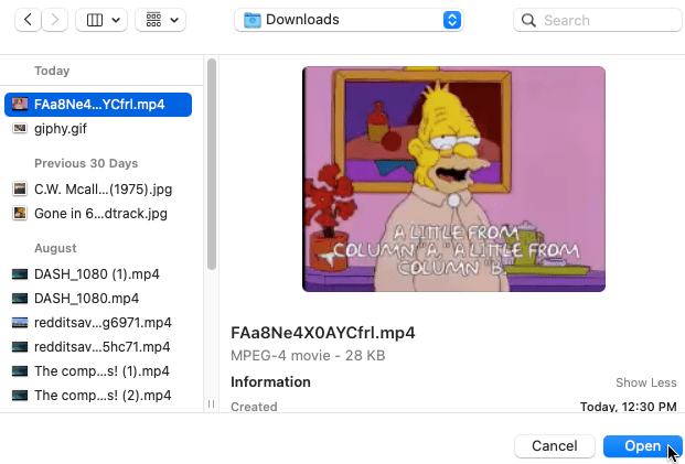 - Select the downloaded video and click "Open" to add it to EZGIF.COM.